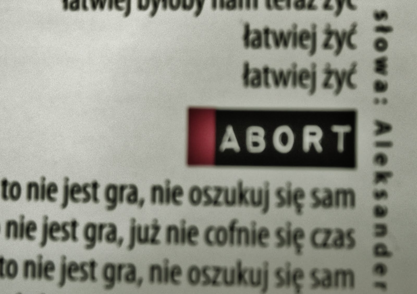 ABORT to aborcja. To jest najważniejszy temat utworu. Temat bardzo popularny i kontrowersyjny, tak jak eutanazja czy in vitro. Bardzo wyraźnie aborcja jest tutaj krytykowana. Bo czy mamy prawo odbierać życie drugiemu człowiekowi? Gdzie poszanowanie prawa do życia? Nie bawmy się w Boga, gdy Nim nie jesteśmy. Tekst jest sumieniem osoby, która popełniła grzech aborcji. Co zauważamy? Emocje, wyłącznie negatywne, bo tylko te towarzyszą człowiekowi po takich zabiegach. Opisuje pustkę, żal, nienawiść, gorycz, lęk. Paletę negatywnych uczuć. Wyrzuty sumienia i płacz. Jedna nieodpowiedzialna decyzja prowadzi do zniszczenia nas samych.